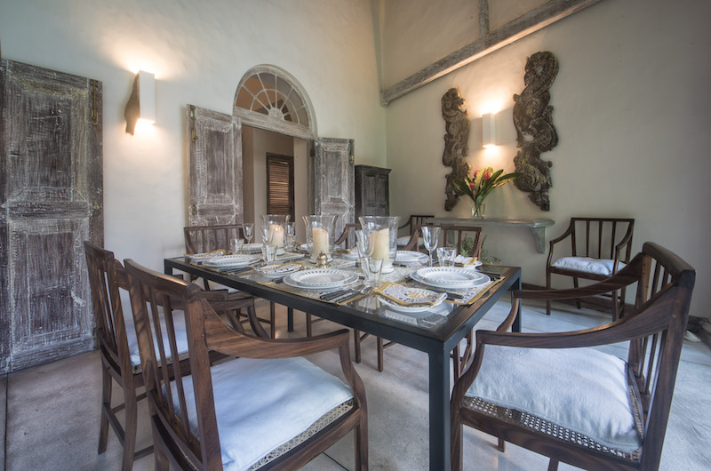 The villa’s glass-topped dining table is located out on the shaded terrace, allowing for scenic alfresco dining.