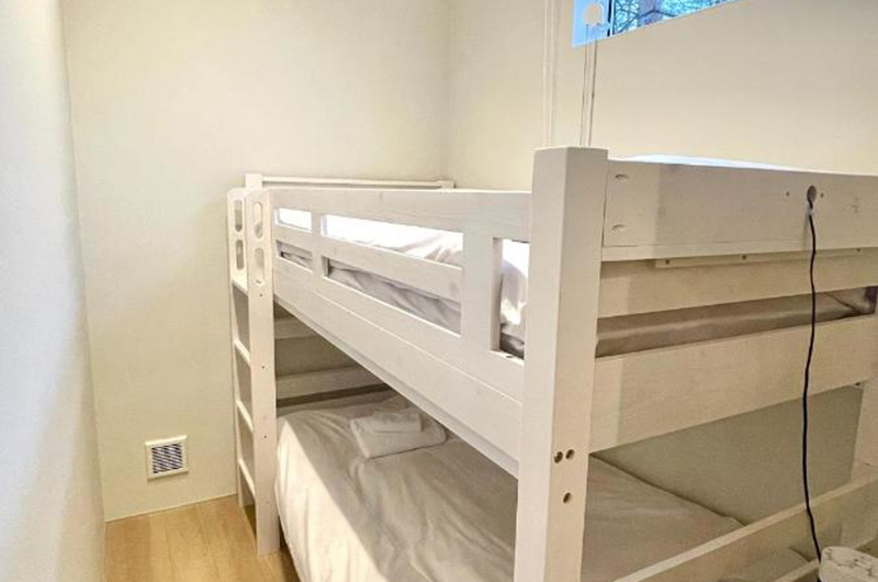 The fourth bedroom is located upstairs next to the living and dining room. This room is smaller in size and features a set of bunk beds. A powder room adjoins the room.
