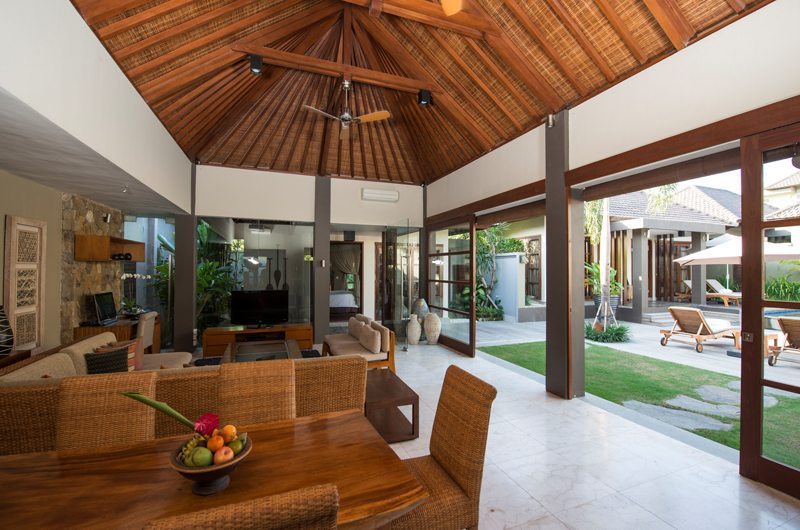 The living room opens out to poolside views through bi-fold doors, which can be closed to enjoy the AC or thrown open to let in a fresh summer’s breeze. The living room houses an L-shaped sofa perched in front of a flatscreen TV.
