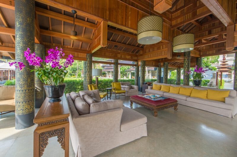 The villa features an open living sala furnished with lavish seating and offering views of the pool. There’s also a closed indoor living area, which is protected by majestic pillars and crowned by a stunning thatched roof.