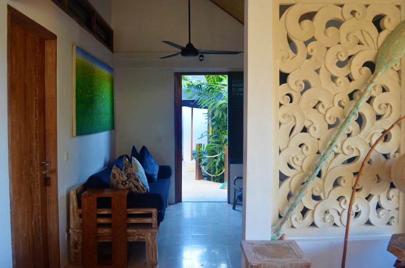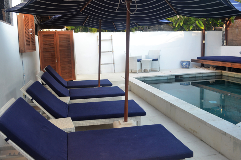 The villa’s turquoise pool is hugged by a white sundeck dotted with blue sun beds and matching parasols. You can also work on your tan on the open-air balcony, which includes a day bed. There’s also a covered bale gazebo by the pool with plush cushions ideal for an after-swim nap.