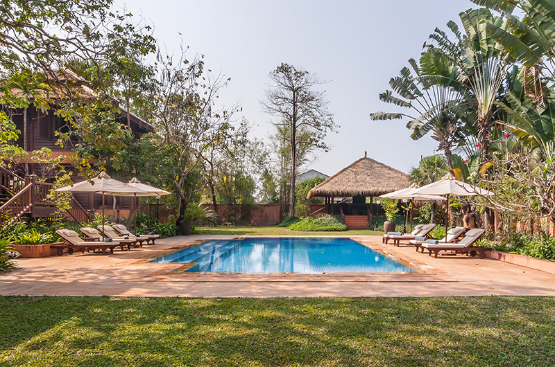The villa sits amid fairy-tale gardens blooming with exotic flowers and lush trees. Imposing stone statues and serene fishponds further add to the magical ambiance. The wooden villa perfectly blends with its lush surroundings and provides a picture perfect backdrop for the glorious 14-metre long pool hidden amid the greenery. The beautifully tiled pool features wide steps, with a substantial statue of King Jayavarman VII presiding over this serene tableau. The pool is surrounded by a row of sun beds and parasols on either side, inviting guests to get lost in the tropical splendour that surrounds.