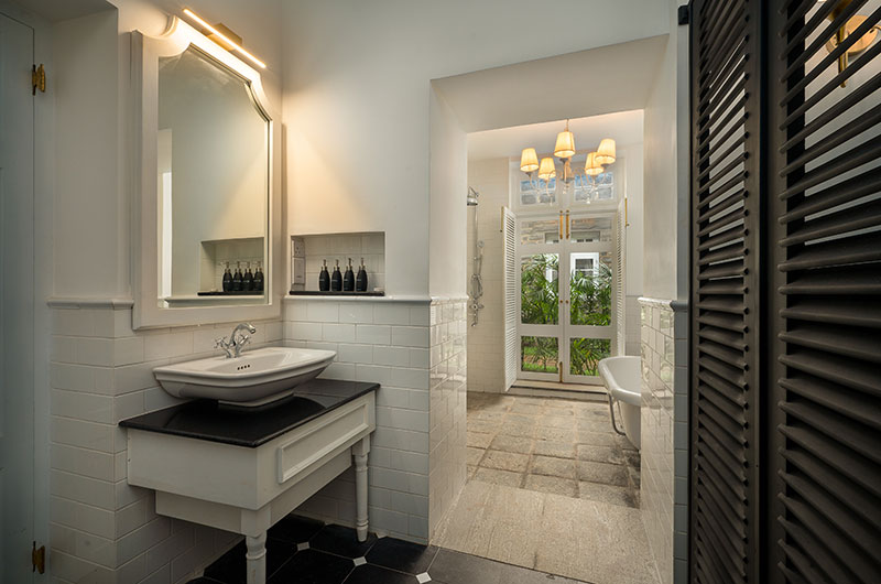 The first bedroom features a beautiful four-poster bed, sofa seat, and a flatscreen TV, and looks out to lush garden views. The ensuite bathroom boasts a luxe bathtub, shower, vanity, and a toilet.