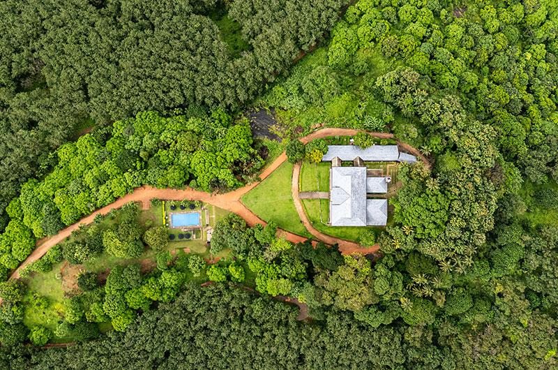 The estate is completely immersed in greenery, revealing gorgeous views from its hilltop vantage point. From the main house, steps cascade down to generous lawns, eventually leading down to a pristine blue pool. The pool is framed by a row of sun beds poised for basking in the sunshine, while the surrounding lawns offer the perfect setting for enjoying afternoon tea.