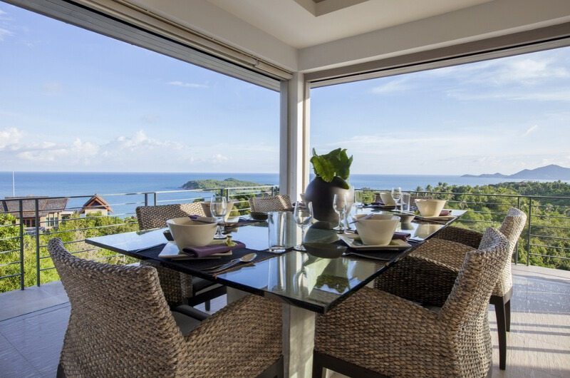 The villa offers a generous 18-metre swimming pool which offers great views of the island and out into the ocean. The pool is surrounded by a generous deck with white sun loungers. If you prefer a place in the shade, there’s also a shaded outdoor lounge with plush seating and a sunken Jacuzzi tub and outdoor shower.