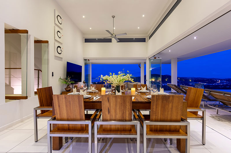 The villa’s dining area is part of the open-plan living space with a beautiful teak dining table and cushioned wooden chairs that can seat six people. A granite breakfast bar with four high stools separates the dining area from the fully-equipped western style kitchen. Meals can also be set outside by the pool.