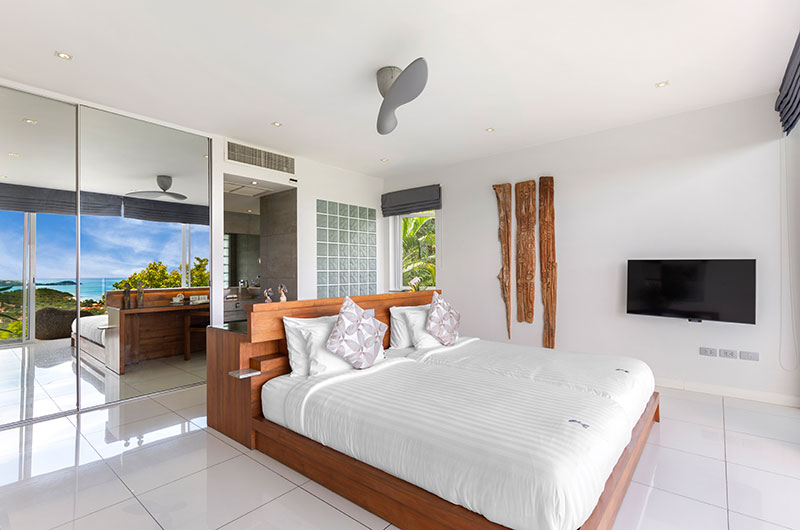 The fourth bedroom is located on the lower level and comes with a king-sized bed, garden-view balcony and an ensuite bathroom with a shower.