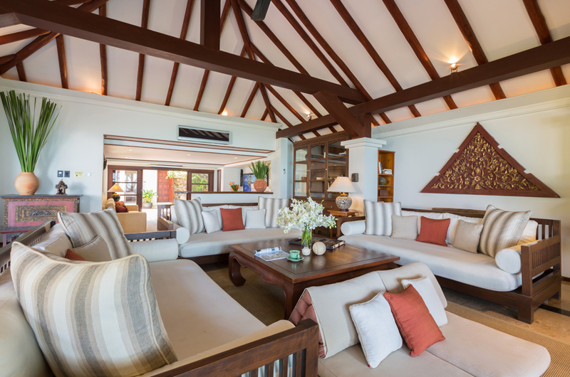 A fully-equipped Western style kitchen is set alongside a Thai style outdoor kitchen. The kitchen serves a large dining room seating 14. Sliding glass doors open onto a wooden deck, with al-fresco dining set for 14 overlooking the garden, pool and sea beyond.