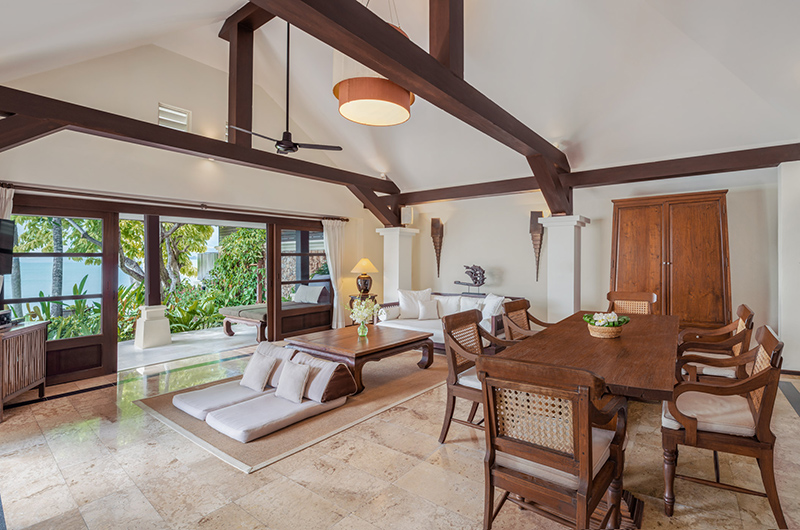 The spacious air-conditioned lounge features sumptuous sofas, overlooking the beautiful sea views through sliding glass doors.