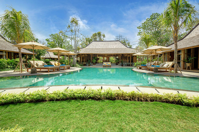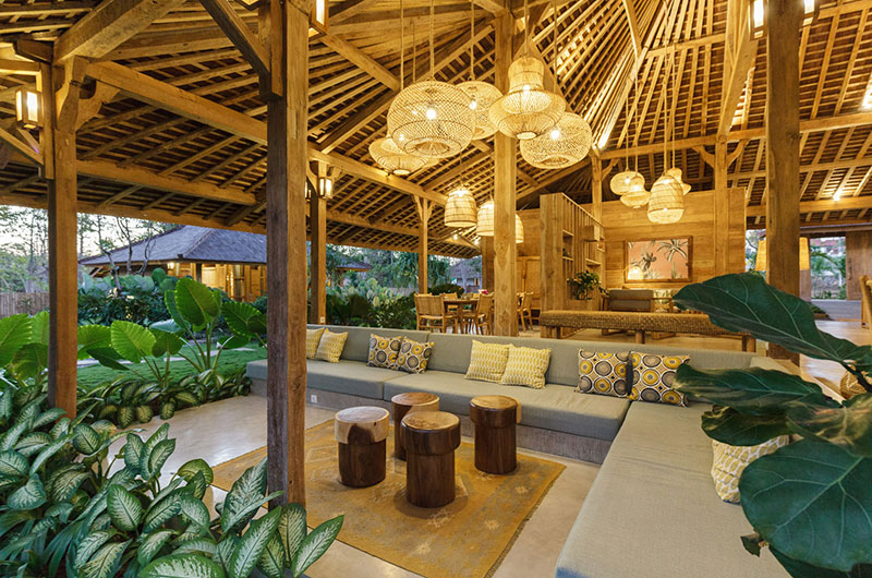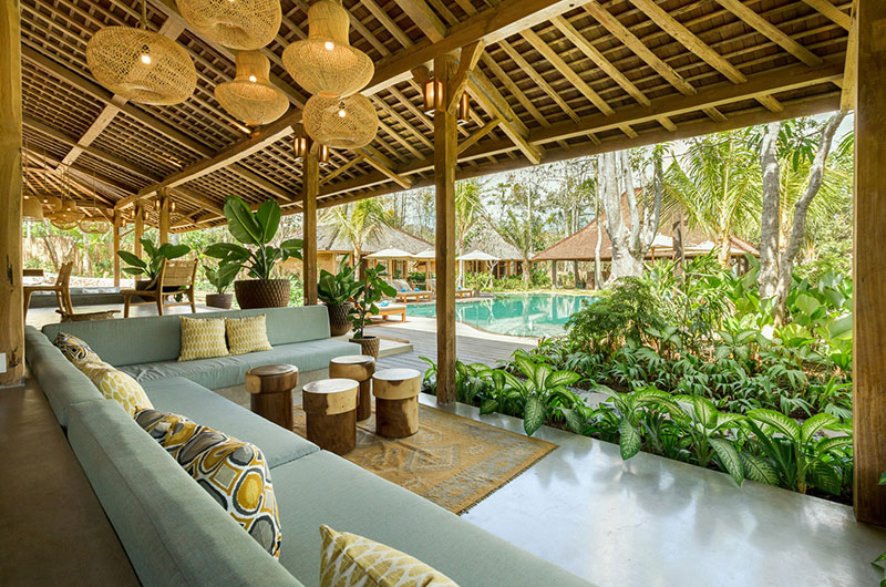 Housed in a beautiful pavilion that overlooks the pool, the living areas are the perfect embodiment of Bali’s relaxed lifestyle. Thanks to the open plan layout, guests enjoy a constant connection to the lush green gardens throughout the day. In keeping with the villas sprawling stature, there are several seating areas to relax in. The main lounge area centres on an elegant built-in sofa that looks over the pool, with several chill out spots scattered throughout the pavilion. In case you need a little quiet time away from the group, each of the bedroom pavilions is also adjoined by a private veranda.