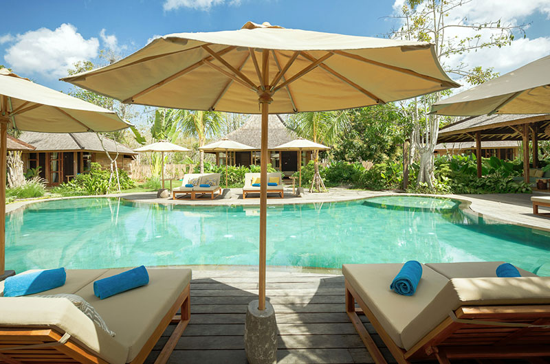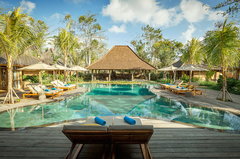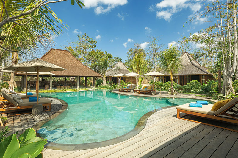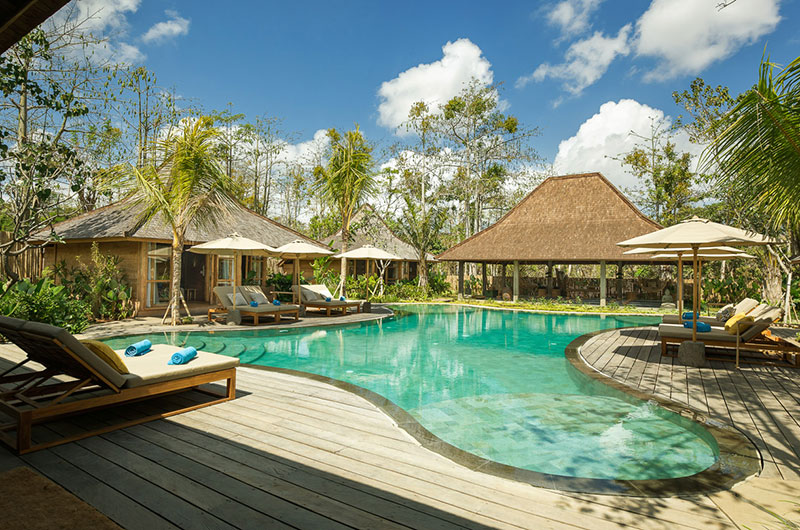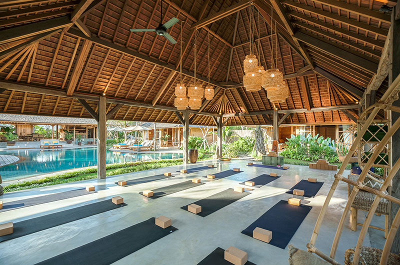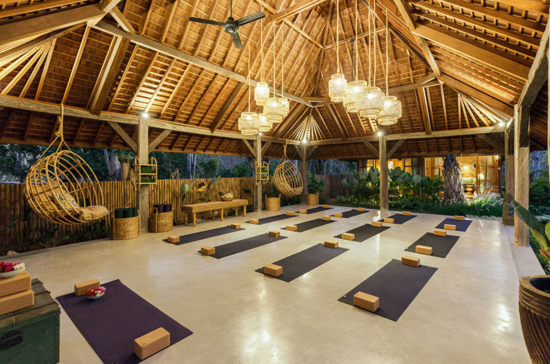 Bingin Retreat is set amidst beautiful tropical gardens featuring lush vegetation and generous lawns that are perfect for some fun and play. At the centre of the property is a showstopping swimming pool whose freeform shape resembles that of a flower or perhaps a natural lagoon hidden in the tropics. All four corners of the pool feature generous shallow sections that are perfect for the kids to splash and play. The pool is surrounded by a sun deck dotted with deck chairs and parasols, so you’ll always have a choice between sun and shade. The pool is bookended by the living pavilion at one end and a stunning, open plan yoga shala at the other. The shala, which can host up to 24 yogis with ease, is fully stocked with yoga mats, blocks and straps.