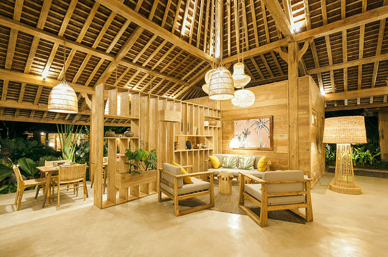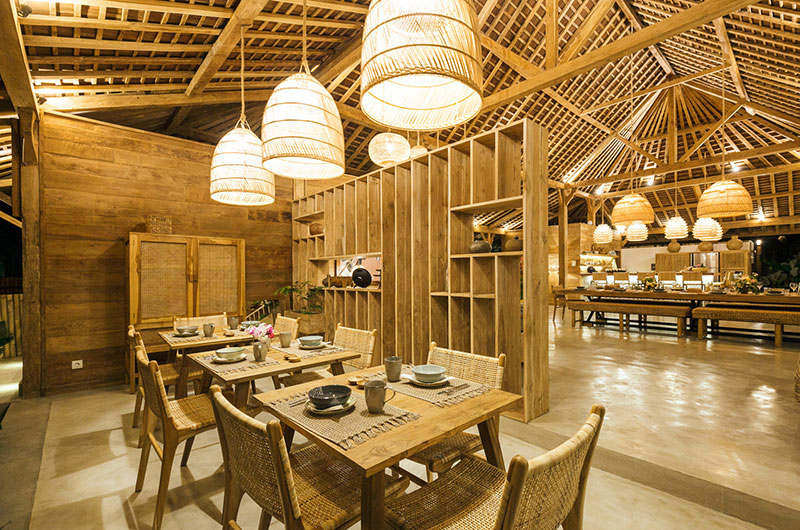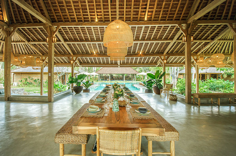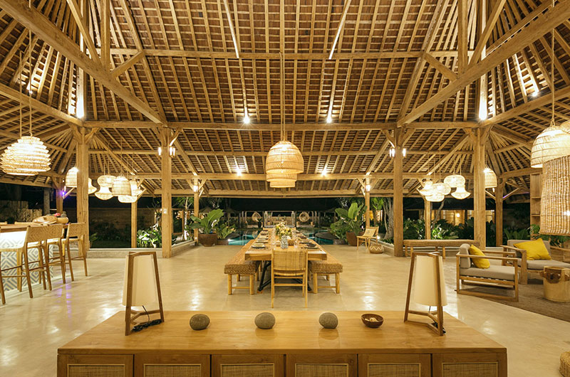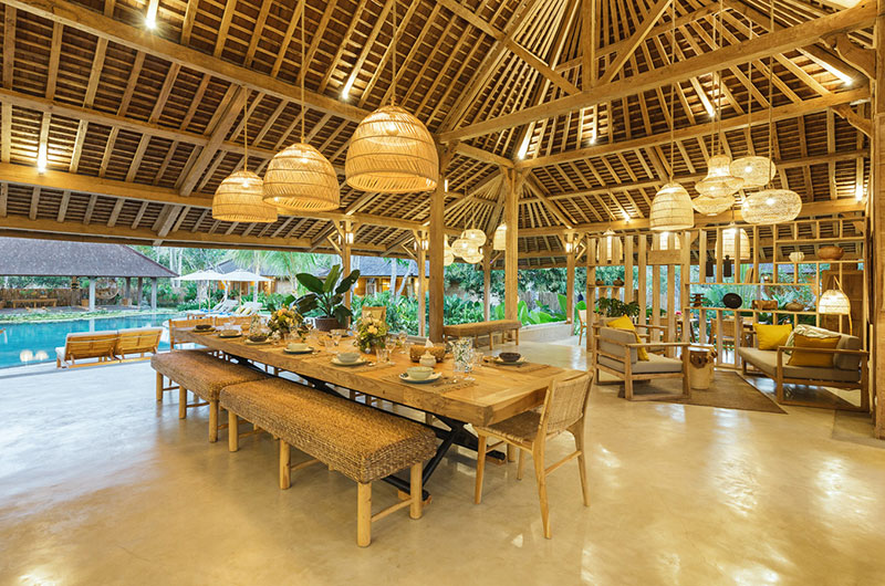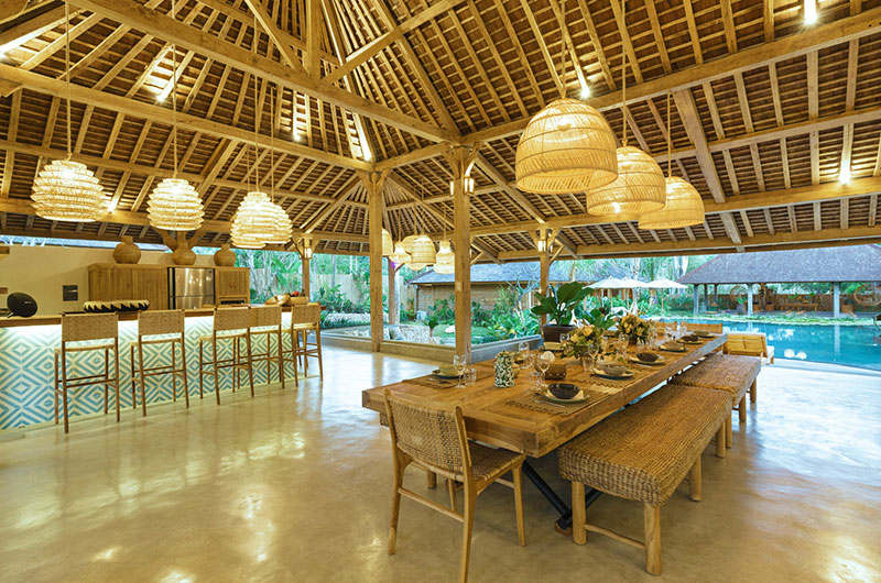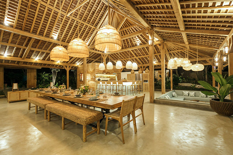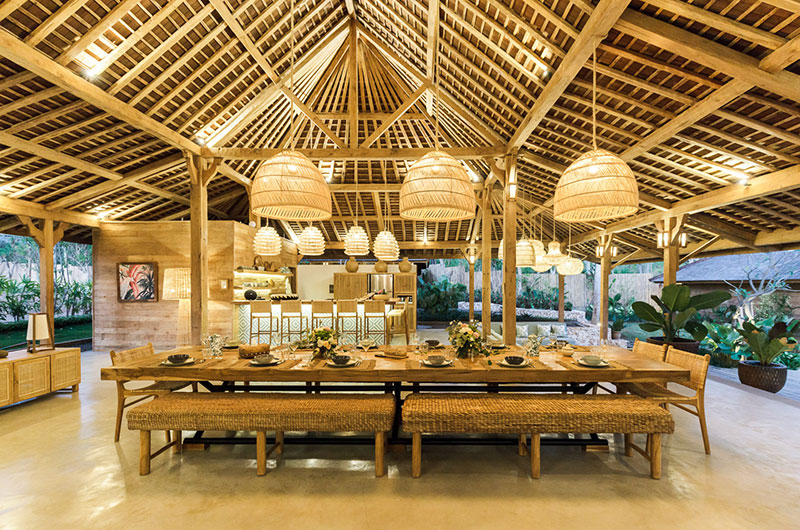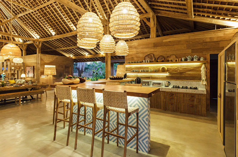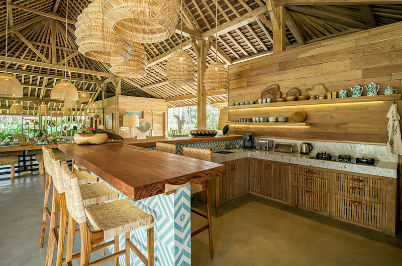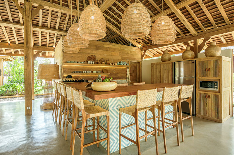 The dining area is simply stunning, housed beneath the vaulted ceiling of the open plan main pavilion. The dining table is nice and long and it’s surrounded by rattan benches and dining chairs. Rattan lanterns suspended from the sky-high ceiling add to the bohemian feel of the space. If you prefer, you can also enjoy your meals out on the covered veranda. Close to the main dining area is the villa’s beautifully styled guest kitchen, with a second staff kitchen discretely tucked away from the living areas.