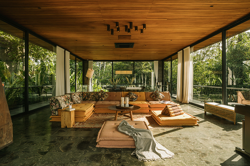 The living room is a huge space filled with natural light, surrounded by mesmerising views of the surrounding jungle and the infinity pool that occupies the same floor. The space features an elegant seating area furnished with ample sofas and chairs in carefully chosen natural hues, arranged around a beautifully carved wooden coffee table.