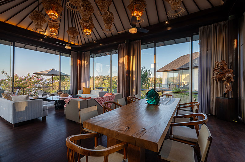 That gorgeous glass encased living room also houses the villa’s formal dining area. Crafted from a beautiful slab of wood, the dining table comfortably seats 10 and provides glorious views of the ocean.