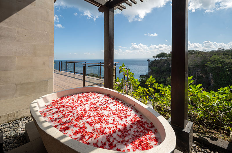 By The Cliff sits on the cliffs over Balangan Beach in Bali, Indonesia. The villa is nestled in a refined community of villas and provides jaw-dropping views of the ocean. Balangan Beach is only a five-minute drive away. The villa sits in a relaxed area with a handful of great restaurants tucked between villas, resorts, local residences, and tropical greenery. New Kuta Golf Bali is about a 10-minute drive away, while the vibrant restaurant scene of Bingin can be reached in about 20 minutes or so.