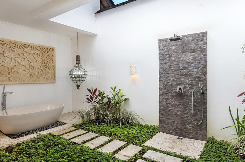 The spacious master bedroom has a king-sized bed and open-air bathroom with a bathtub and shower.