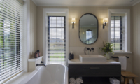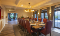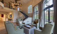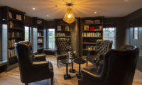 This generous villa offers ample space to relax and entertain with the whole group, with multiple living areas to choose from. On the ground floor, you’ll discover an open-plan lounge space with an arrangement of armchairs along with a cosy living area incorporated to the dining room, where a leather sofa and two red armchairs face a stone fireplace with a flatscreen TV mounted above it. On the upper floor, there is yet another living room, this one decorated with calm earth tones with sofas arranged around a fireplace and TV, with bar tucked to the side of the room. This space is adjoined by a separate lounge room furnished with black leather arm chairs and stocked bookshelves lining the walls.