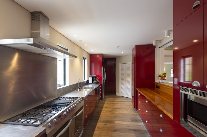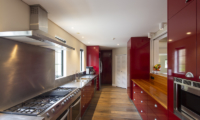 The dining room has the grand feel of a country manor, with a long dining table surrounded by 12 red leather chairs. The space is surrounded by French windows looking out to the garden. Next doors, you’ll discover the villa’s red toned kitchen. There’s also a fabulous outdoor entertaining area with another 12-seater dining table, barbecue and an atmospheric fireplace.
