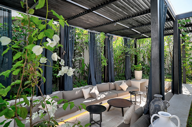 Carpediem is hugged by a sumptuous, 20-metre-long pool which runs the full width of the villa. That glorious blue pool is framed by tropical greenery, while the adjoining deck offers three double sun beds where guests can bask in the rays. The pool is bookended by a fabulous gazebo which features a sunken lounge – the perfect spot for a round of sun downers.