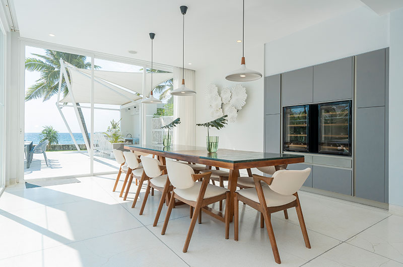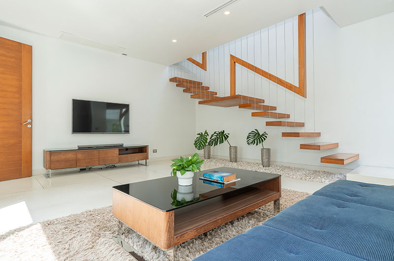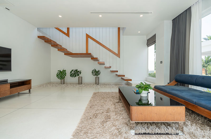 The living room features comfortable sofas overlooking the pool and the beach through glass doors. You can leave the doors open to enjoy the breeze or close them to cool off with the AC on. There’s also a separate TV area by the staircase.