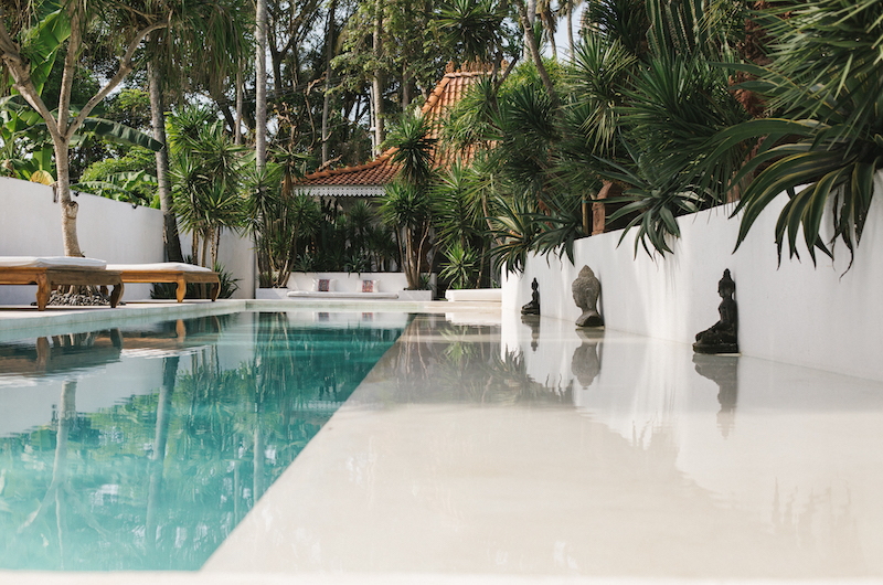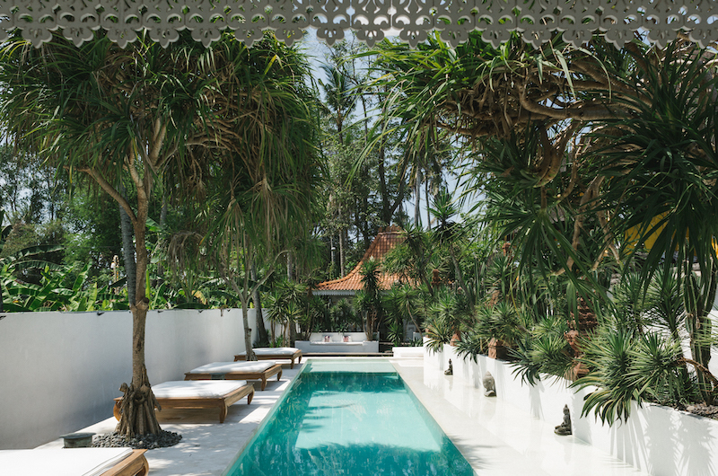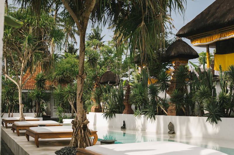 Eco Gypsy House is built around a light turquoise swimming pool lined with resort style double daybeds. The villa’s gardens are a perfect representation of the property’s bohemian chic appeal, with countless cacti and palm trees framing the villa’s white joglo pavilions beautifully.