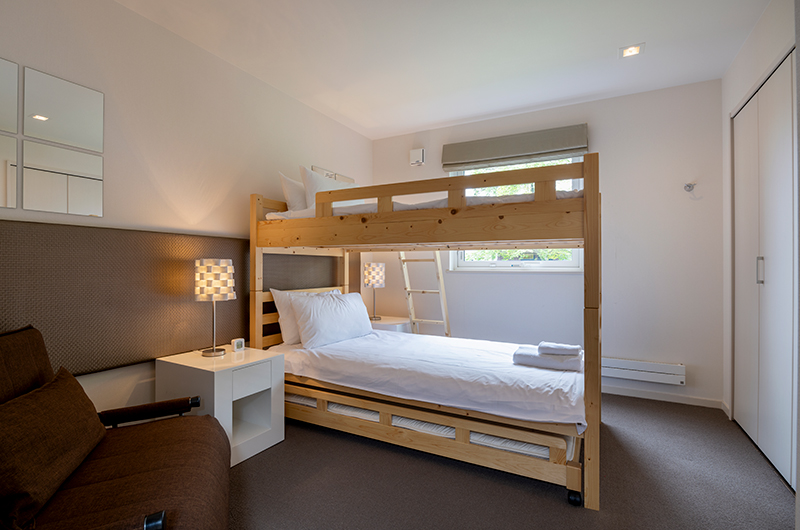 Fo Sho Sansou features three bedrooms. The bedrooms are all housed on the chalet’s upper floor and they all share the same light, bright and contemporary look. Two rooms have a double bed that can also be converted into two singles if needed. The third bedroom features a set of bunk beds. There is a standalone bathroom located on the same floor and another guest bathroom can be found downstairs.
