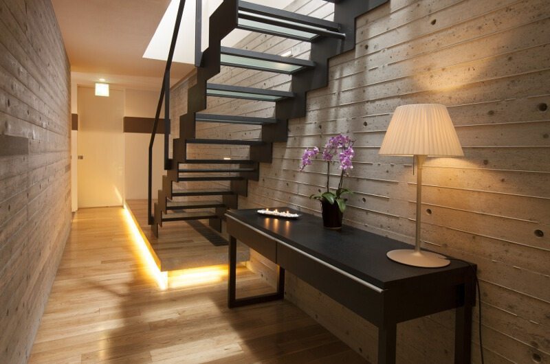 Glasshouse is a five-bedroom chalet that’s built over two floors. The ground floor houses all five bedrooms as well as the villa’s ski room and laundry facilities. The upper floor houses the open plan living and dining room and a standalone Japanese bath.