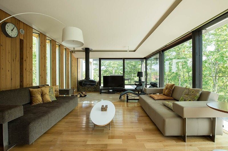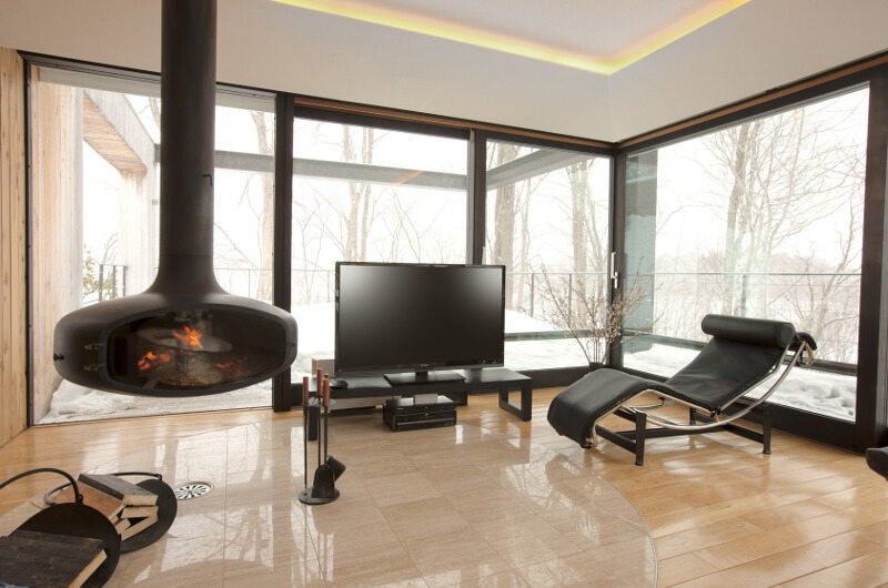 Housed on the upper floor, the living room is surrounded my the house’s namesake windows, providing beautiful views throughout. The living room features a comfortable sofa and a sleek designer chair positioned before a huge flatscreen TV. There’s also a Japanese bath on the same floor, surrounded by windows.