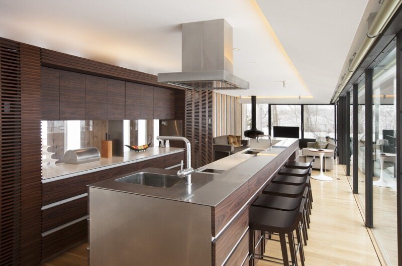 Glasshouse is located on the outer edge of Hirafu Village in Niseko, Japan. It’s a brisk uphill walk to the main street and the ski lifts, but luckily the free shuttle bus stop is just a few minutes’ walk away. There are some great izakaya restaurants in the lower village (about a 10-minute walk or so) and even more options await in the main village which is easily reached by taxi.