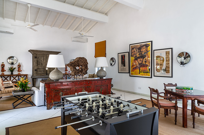 The enclosed entertainment room offers air-conditioned comfort surrounded by the summertime heat, with ample sofas and armchairs arranged around a flatscreen TV. Vintage movie posters framed on the walls add some ambiance to family movie nights. The room also comes with a fun foosball table.