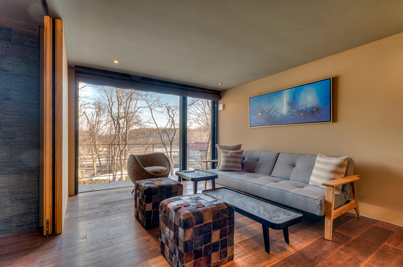 Hideaway on Escarpment’s living room has a generous open-plan layout and features two separate lounge areas. The first features a sofa facing a flatscreen TV flanked by full-wall windows overlooking the mountainside view. The second is a lounge area which with the help of sliding doors can be closed off from the rest of the living room and transformed into a third bedroom. The highlight is the incredible onsen style bath which is built into the living room and overlooks the mountainside views.