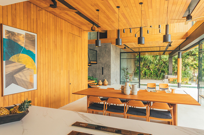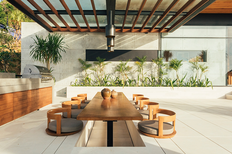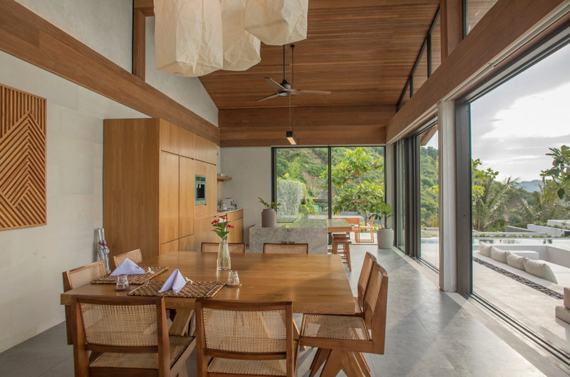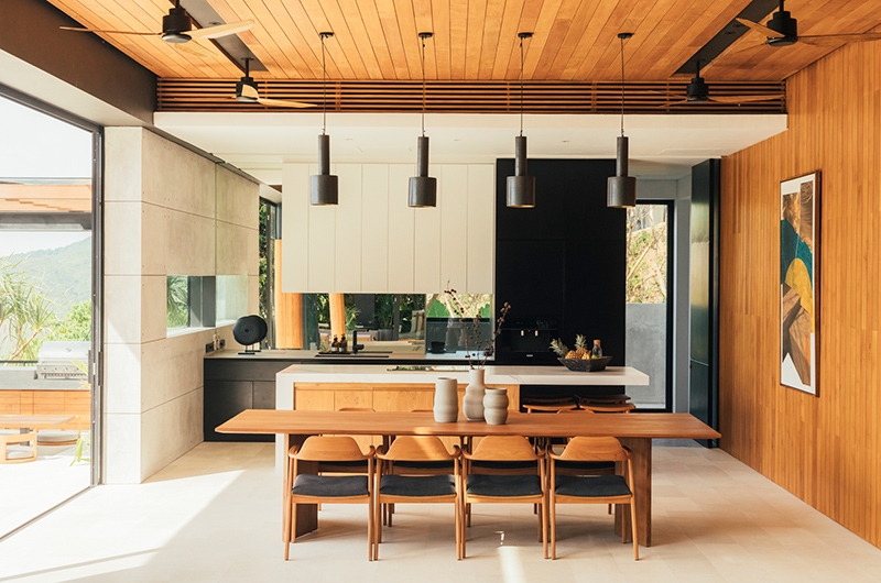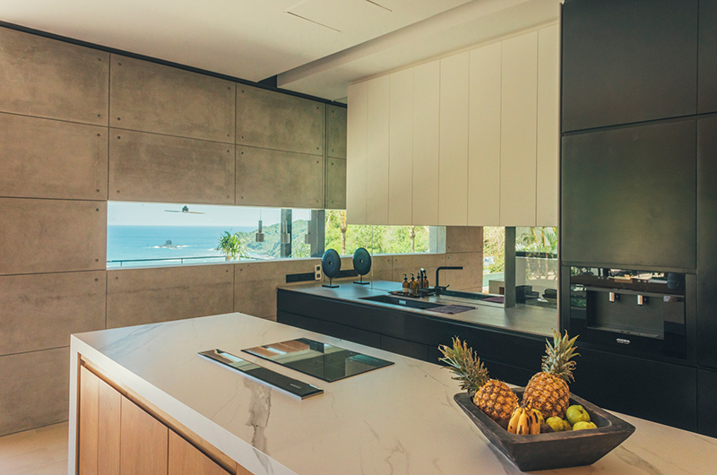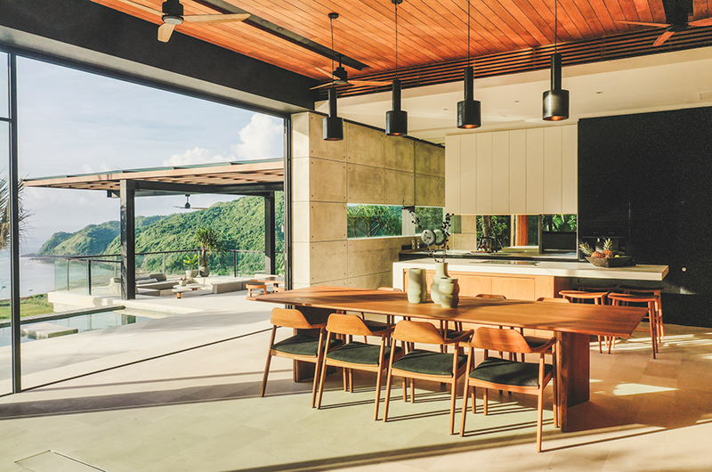 The dining area is a fluid extension of the spacious living room. A few steps up from the sunken lounge area, a timber dining table can comfortably seat all eight guests staying at the villa. The dining area is framed by glass doors looking over the infinity pool and out to the ocean. The dining area is adjoined by an open plan kitchen which is both aesthetically pleasing and well equipped for preparing both light snacks and more substantial meals – all the while enjoying fabulous ocean views.