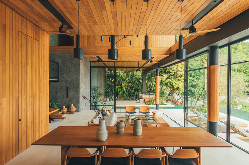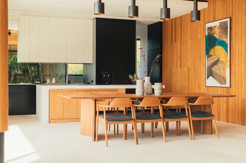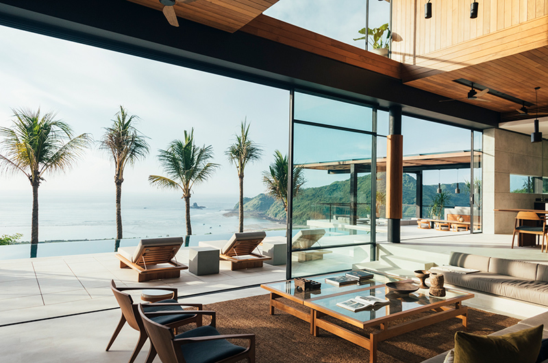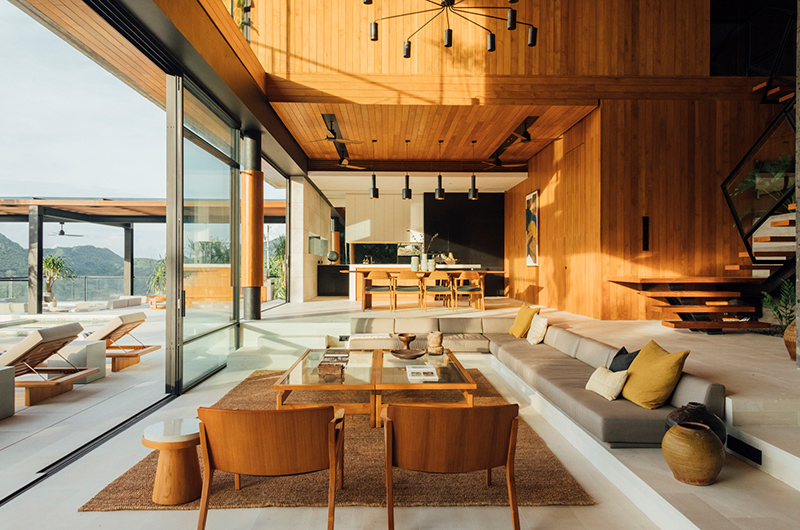 The living room is a grand space opening to panoramic views of the ocean and crowned by a double height ceiling. An elegant sunken lounge offers ample space for socialising and relaxing in style, with a woven carpet and timber furniture adding a subtle bohemian touch to the space. The living room can be left fully open to enjoy a fresh breeze. Alternatively, the glass doors can be closed when you prefer to take a break from the elements.