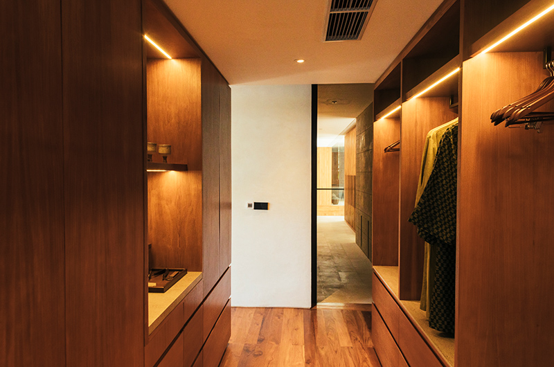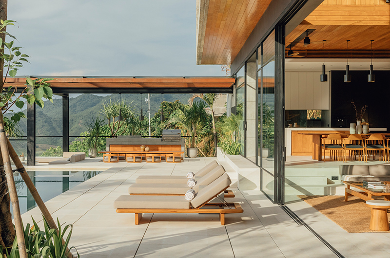 House of Herring is a four-bedroom villa that’s built over two levels. All four bedrooms are located on the upper floor which also houses the villa’s entrance. From this floor, a half-turn staircase leads down to the open plan living and dining areas. This same floor also houses the villa’s 101 square metre infinity pool and outdoor lounge areas. House of Herring is located at the Tampah Hills villa estate.