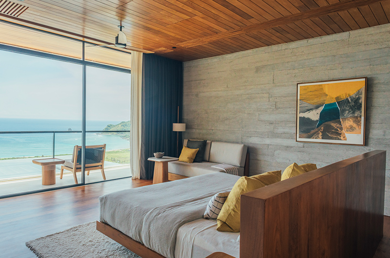The fourth bedroom closely resembles the first bedroom. This room is also characterized by large full wall windows looking out to the ocean. As you enter the room, you’re greeted by a well-appointed walk-through wardrobe. Moving further into the room, you will discover a king-sized bed, a sofa and a flatscreen TV. The luxurious ensuite bathroom features a bathtub placed under a skylight, with a full wall window looking out to the ocean. Dual vanities, a rain shower and toilet complete the setup.
