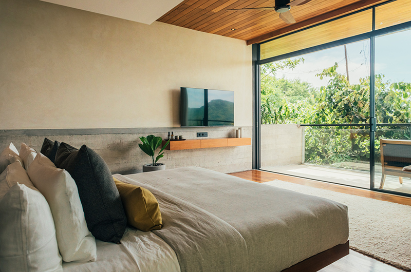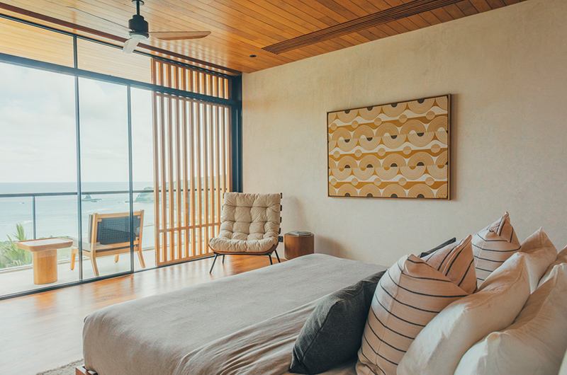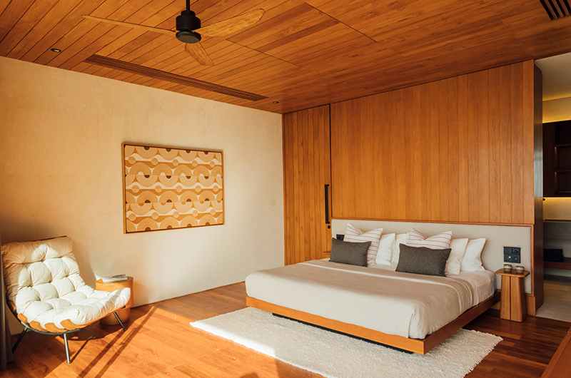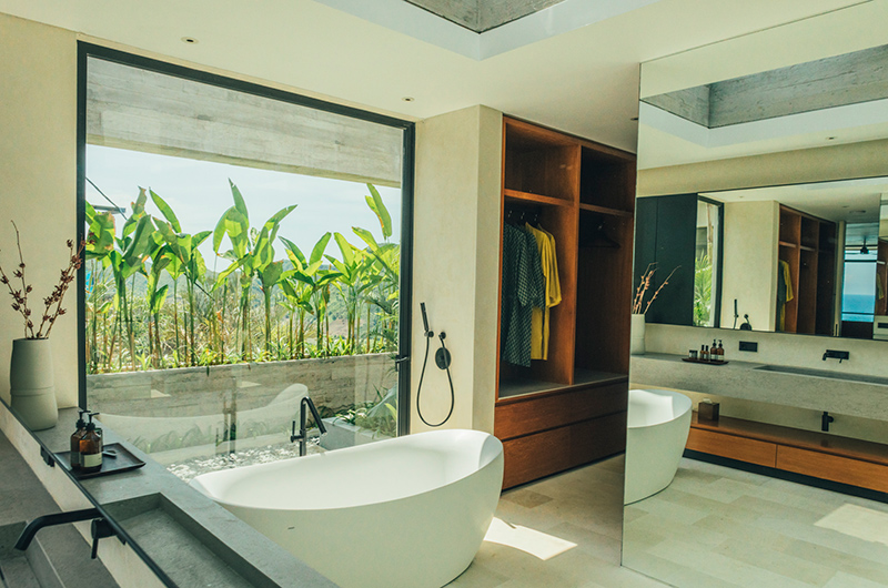The first bedroom is located on the villa’s upper floor, offering sweeping ocean views through full wall windows. The room features a king-sized bed and a plush sofa facing a flatscreen TV mounted on the wall. From the bedroom, a walk-through wardrobe leads to the ensuite bathroom. This beautiful space comes with a standalone bathtub placed under a skylight. The bathroom also features a rain shower, dual sinks and a toilet.