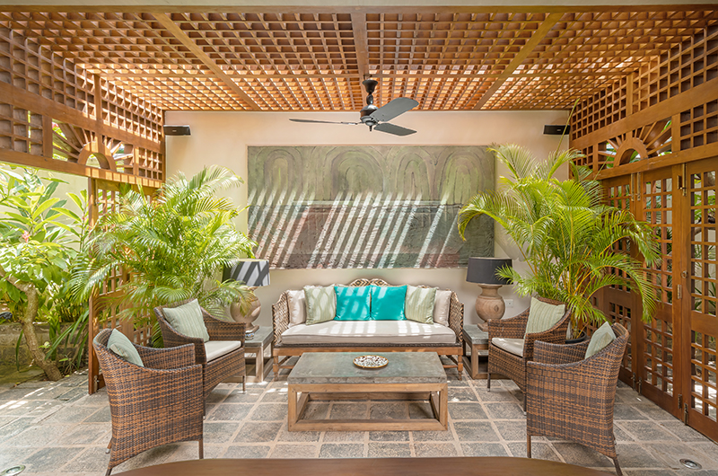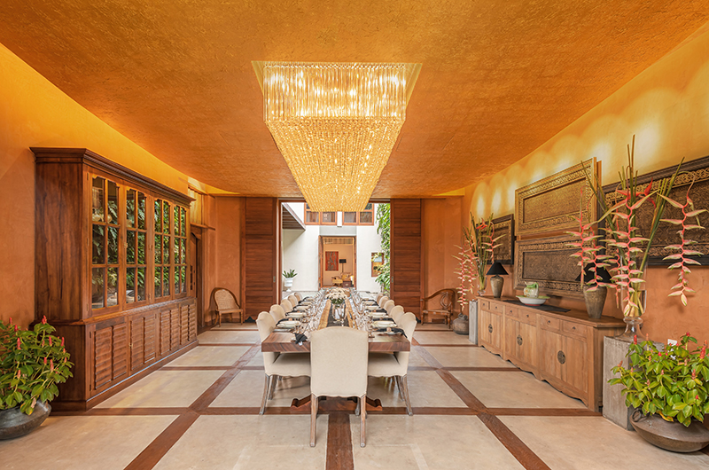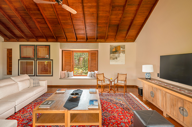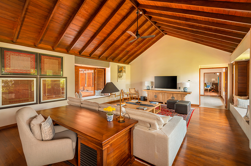 The living room is a gorgeous open plan space located on the villa’s ground floor. Two sides of the room are completely open to the elements, inviting in a gentle breeze while you relax in the shade. One side of the space gives directly to the pool, while the other side looks out to the courtyard garden. The living room is incredibly spacious and features two distinct seating areas with elegant armchairs and sofas arranged around coffee tables. The walls are lined with artwork. There is also a library room on the same floor – the perfect spot for catching up on some holiday reading or perhaps indulging in a lazy afternoon nap. The upper floor houses yet another living area, a beautiful space with a vaulted ceiling furnished with elegant sofas, antique chairs and ample bookshelves.