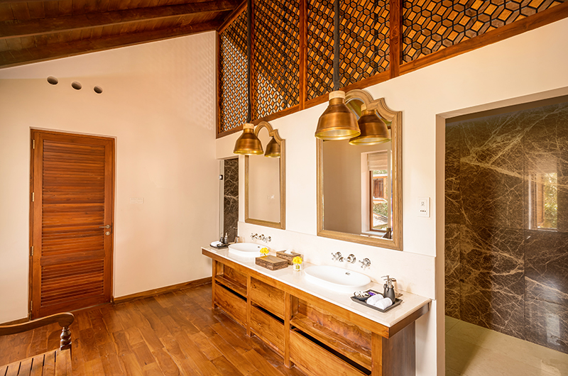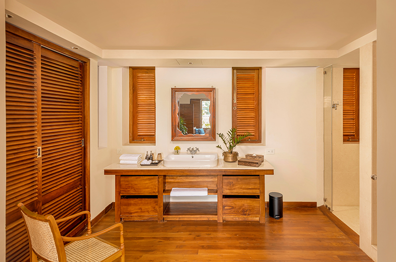 The third bedroom also occupies the villa’s upper floor. Positioned in a corner, this room overlooks the pool through generous windows. The room is decorated in warm timber hues and regal touches of blue and comes furnished with a king-sized bed and a large flatscreen TV. The ensuite bathroom is fitted with a rain shower, a washstand and a toilet.
