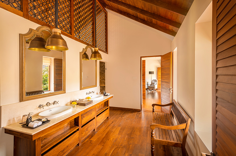 The first bedroom is one of three rooms located on the villa’s upper floor. This is a grand space decorated with opulent carpets and tapestries, with windows opening to enviable views of the pool and garden. The bedroom is furnished with a four-poster bed and a pair of elegant chairs, while the lounge area comes with a comfortable sofa set and a TV. An opulent dressing room connects the room to the ensuite bathroom which features a rain shower, twin basins and a toilet.