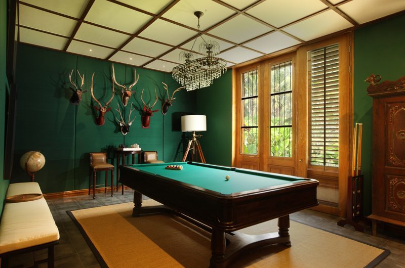 The games room oozes old world glamour with its pool table, chandelier and antlers mounted on the wall, with emerald green walls echoing the colouring of the billiard table.