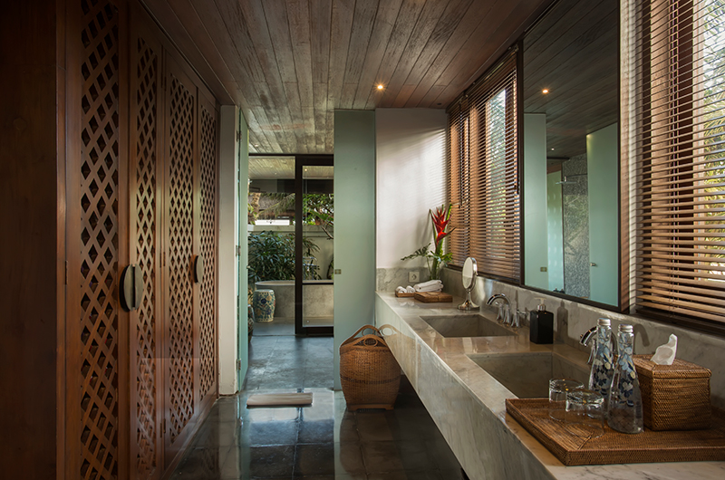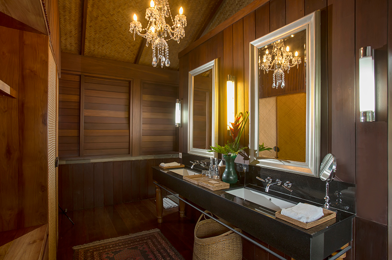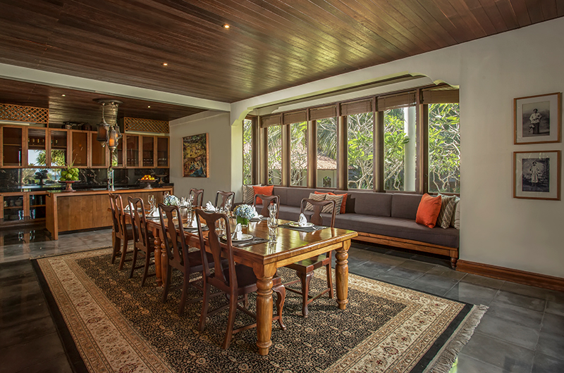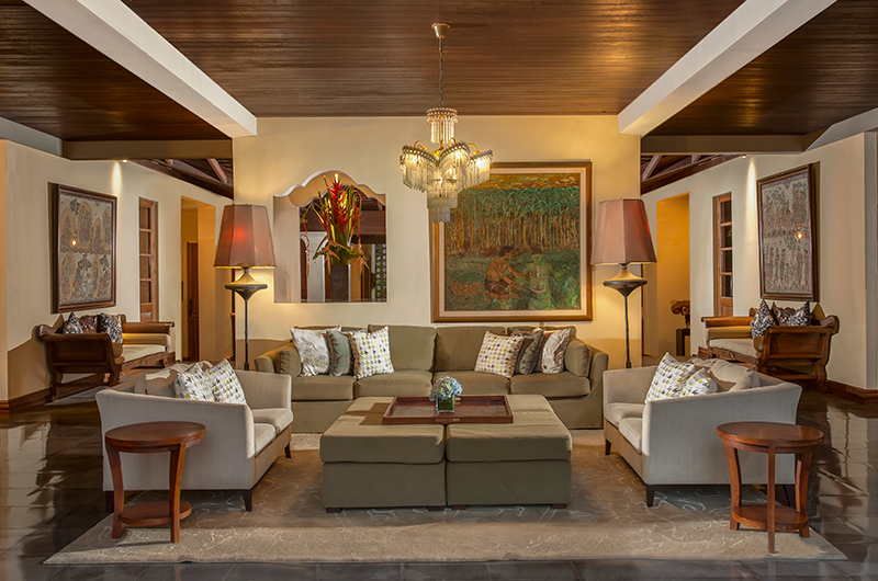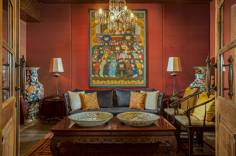 Jeeva Saba Estate was designed for entertaining and the villa offers more than enough room for the whole group to get together in. The main living room is housed in the Beach House, with glass doors opening to views of the pool and out to the ocean. As you first enter the villa, you’re welcomed to this space by spectacular indoor fountain. Lit up by a grand chandelier, the room offers an elegant arrangement of sofas, with the walls lined with beautifully carved details and art. Close by is an atmospheric “tea room” with red walls, plush seating and walls lined with oriental art pieces.