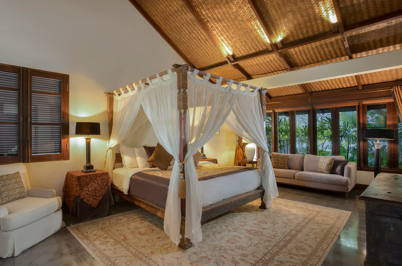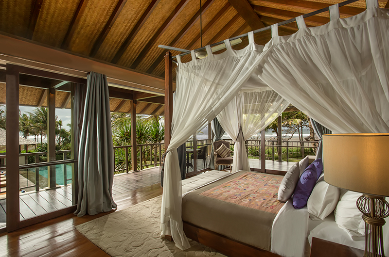 The fourth bedroom is located next to bedroom three on the upper floor of the Beach House and features a king-sized four-poster bed and an ensuite bathroom with an outdoor bathtub and shower.