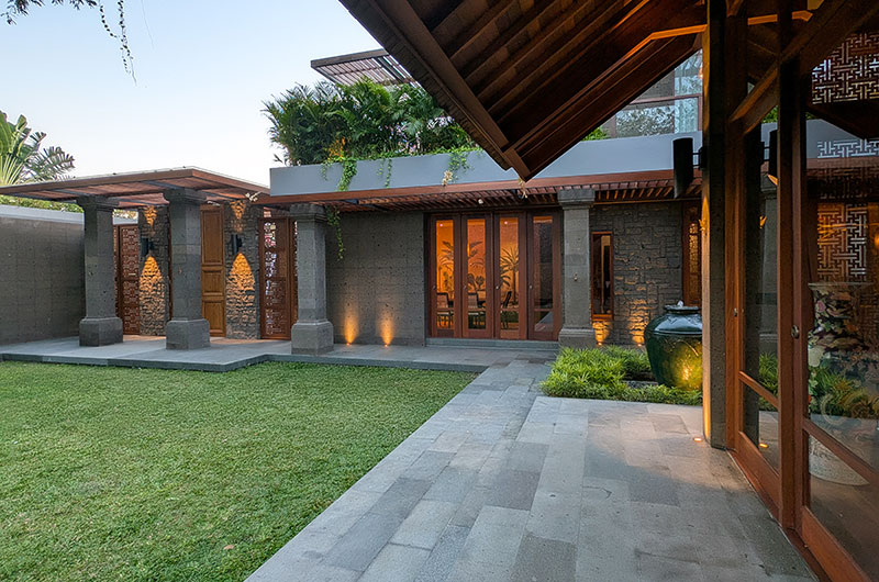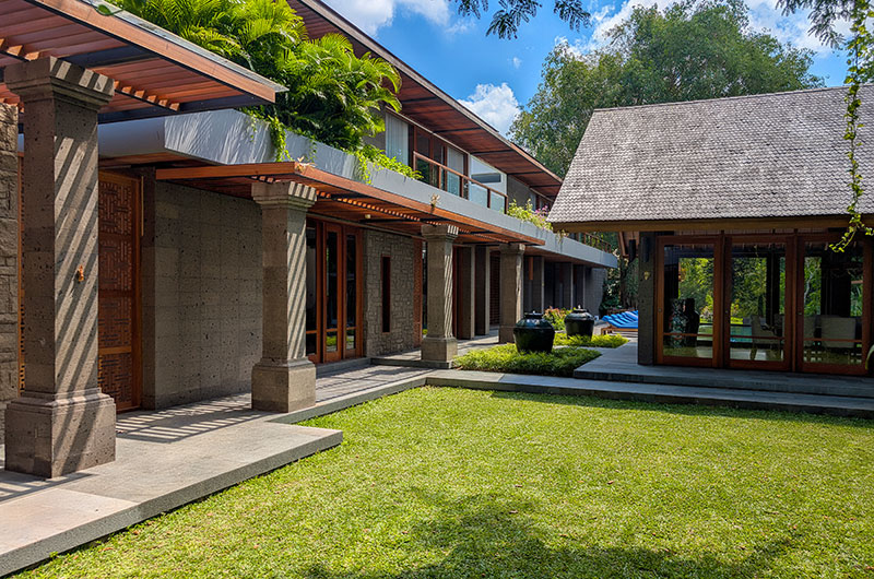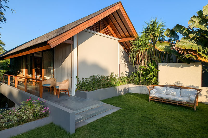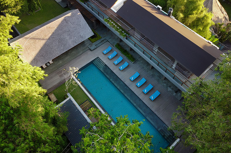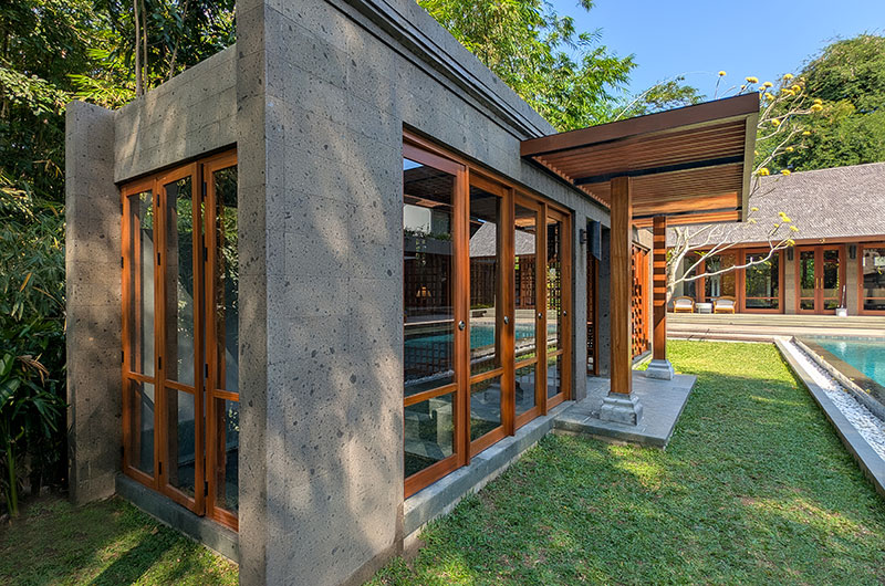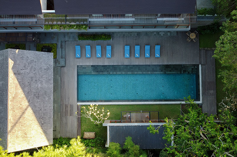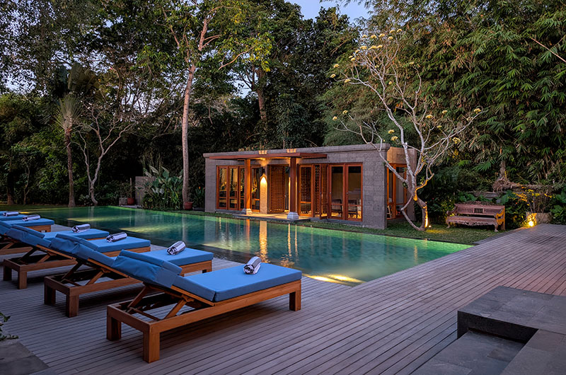 Jeeva Tirta is a four-bedroom villa that’s divided into three pavilions. The villa features open plan living areas, an enclosed dining room, gym, spa room, and an onsen bath. The four bedrooms are all ensuites. The villa also has a TV room which can be converted into a fifth bedroom if needed. The villa features large gardens and a 25-metre-long swimming pool.
