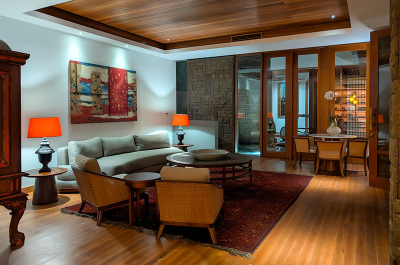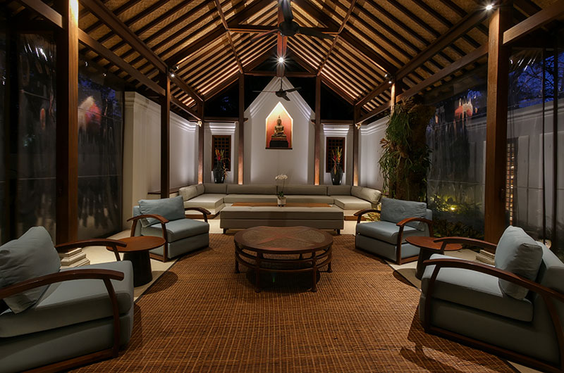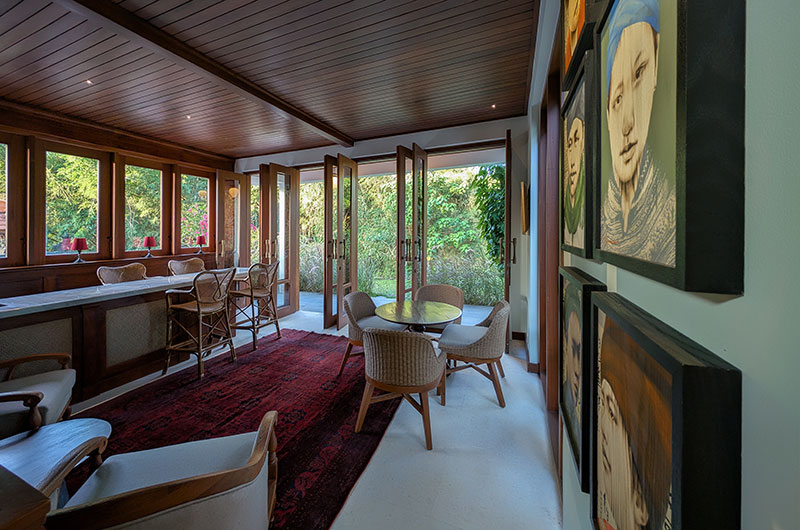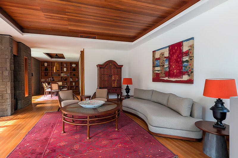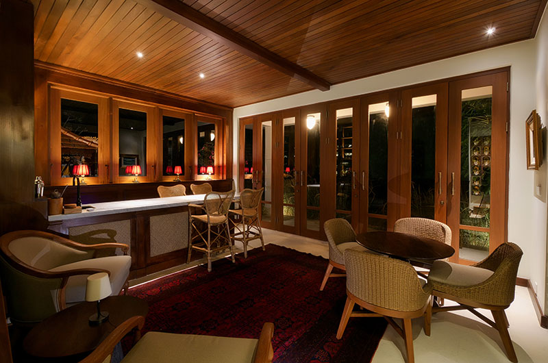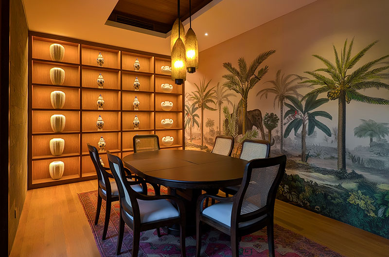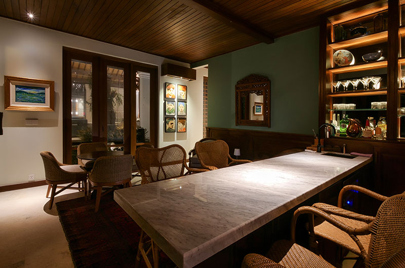 The living room has some real wow factor. Housed in a majestic open sided pavilion, the space lets you enjoy the tropical atmosphere to the fullest. Adorned with statues and mementoes, the living room features a large, u-shaped sofa and an arrangement of armchairs. The setup is ideal for hosting a large group for relaxed get-togethers. When you want to escape the tropical elements, you can retreat to the villa’s elegant library room for a quiet chat or a spot of reading.