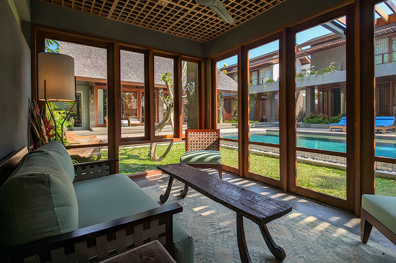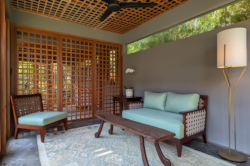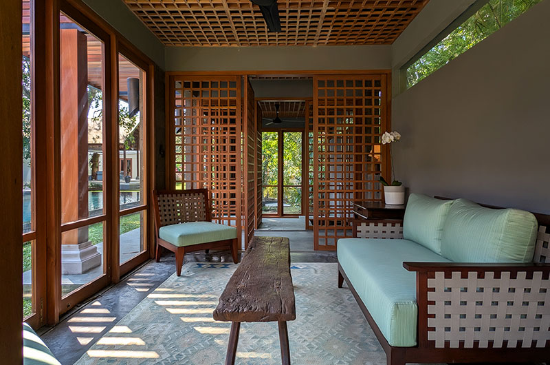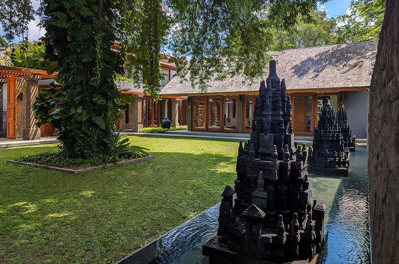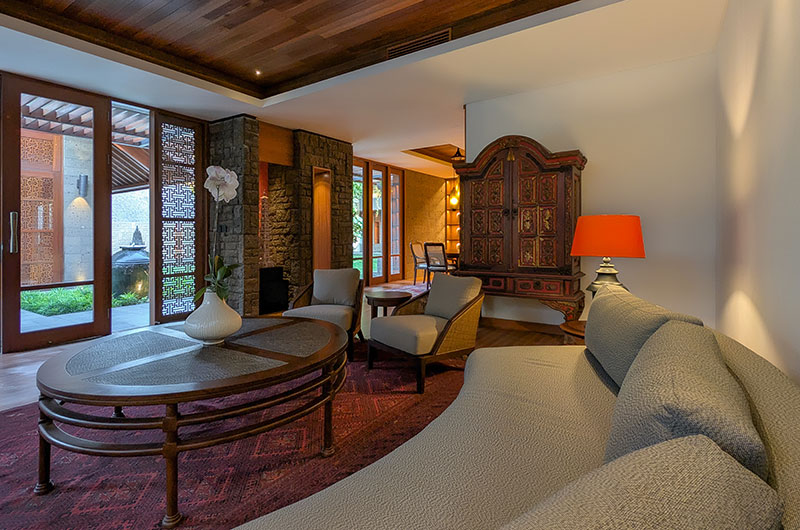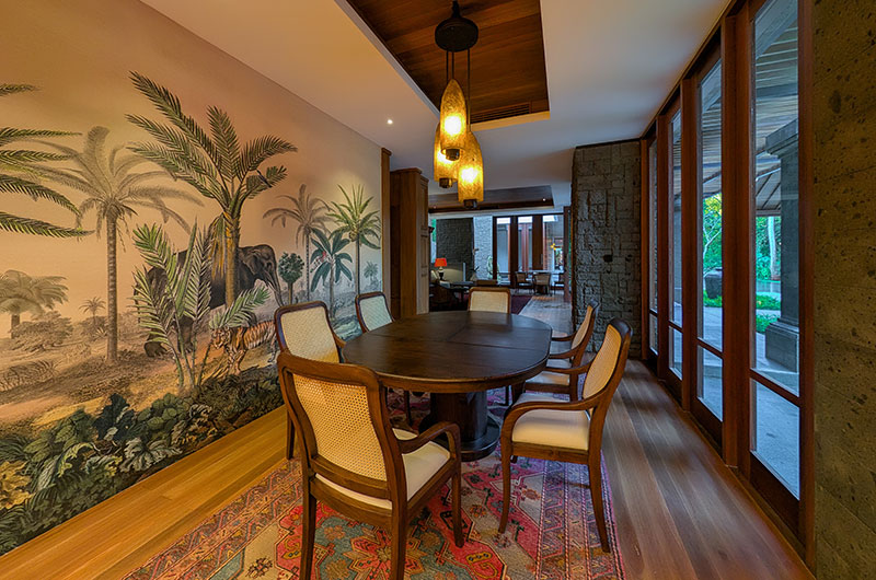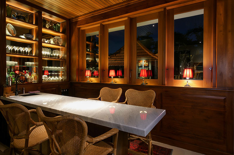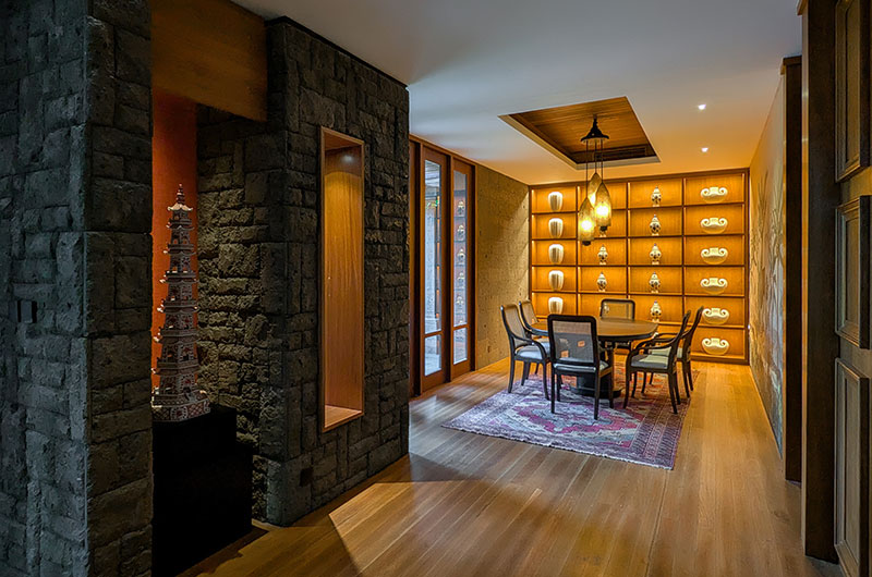 The living room has some real wow factor. Housed in a majestic open sided pavilion, the space lets you enjoy the tropical atmosphere to the fullest. Adorned with statues and mementoes, the living room features a large, u-shaped sofa and an arrangement of armchairs. The setup is ideal for hosting a large group for relaxed get-togethers. When you want to escape the tropical elements, you can retreat to the villa’s elegant library room for a quiet chat or a spot of reading.
