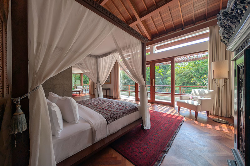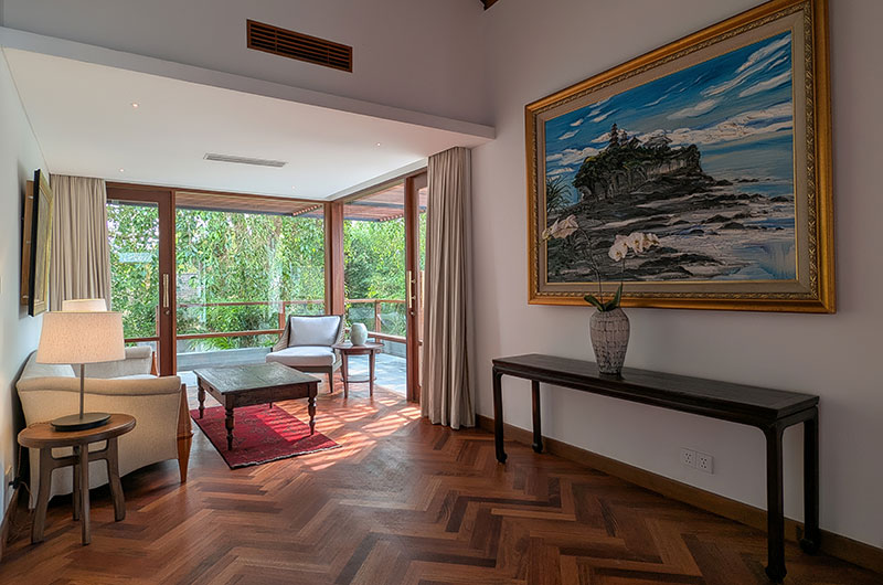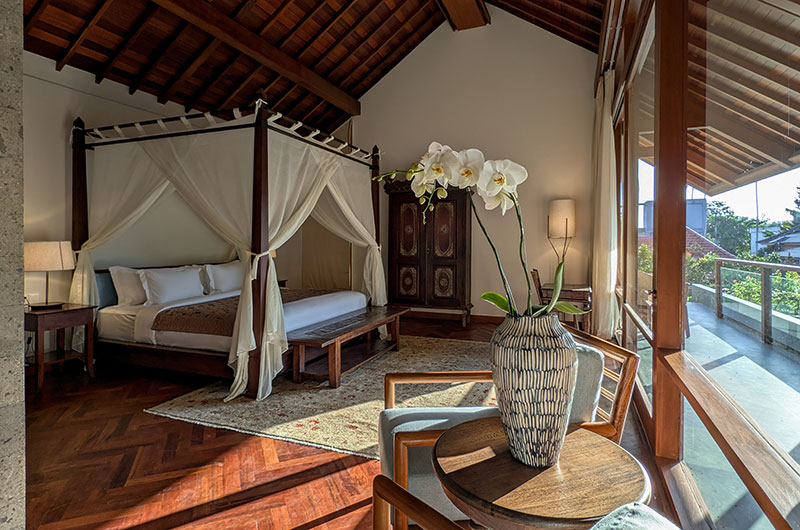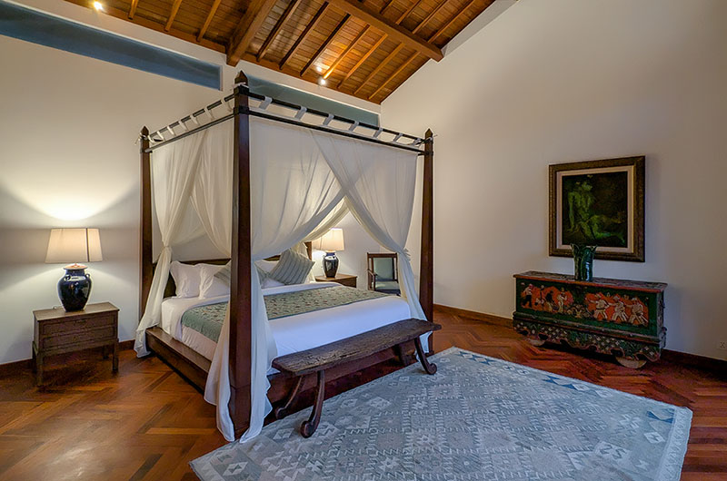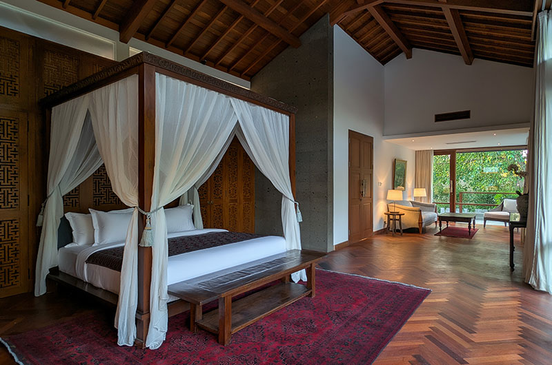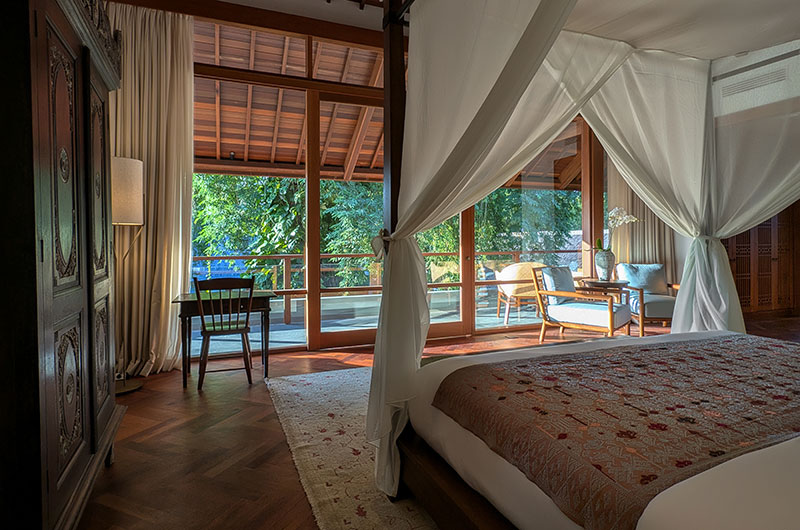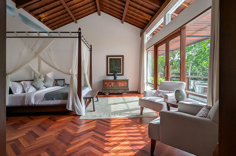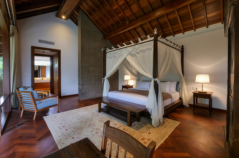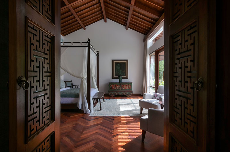 Jeeva Tirta features four bedrooms. The bedrooms exude classic Balinese elegance: think canopy beds, ornate carpets, and beautiful timber pieces. All rooms feature beautiful ensuite bathrooms. If you need extra space, the library room can be converted into a fifth bedroom.