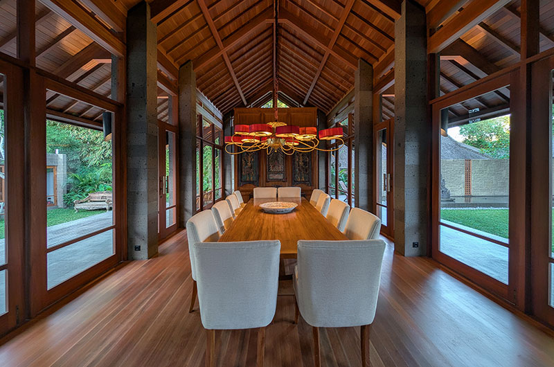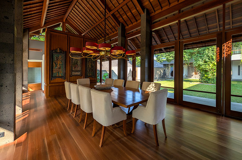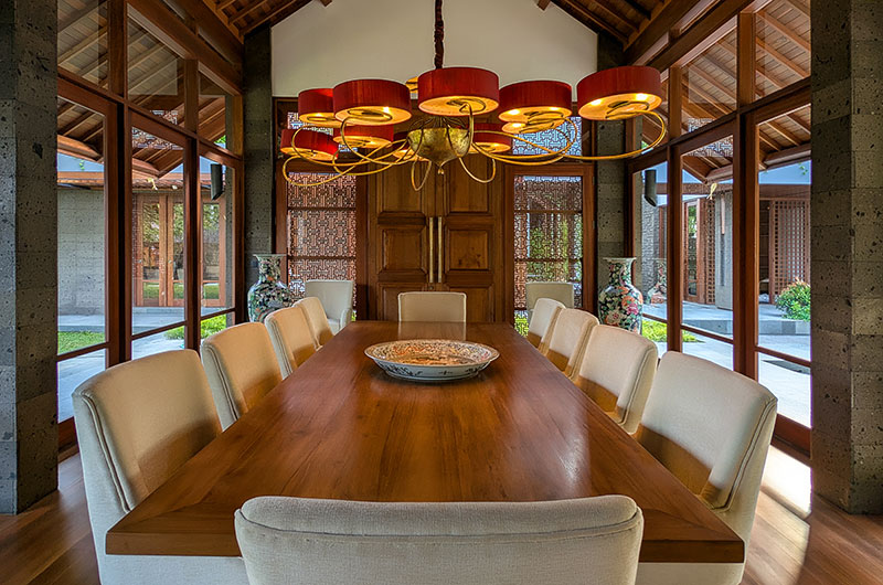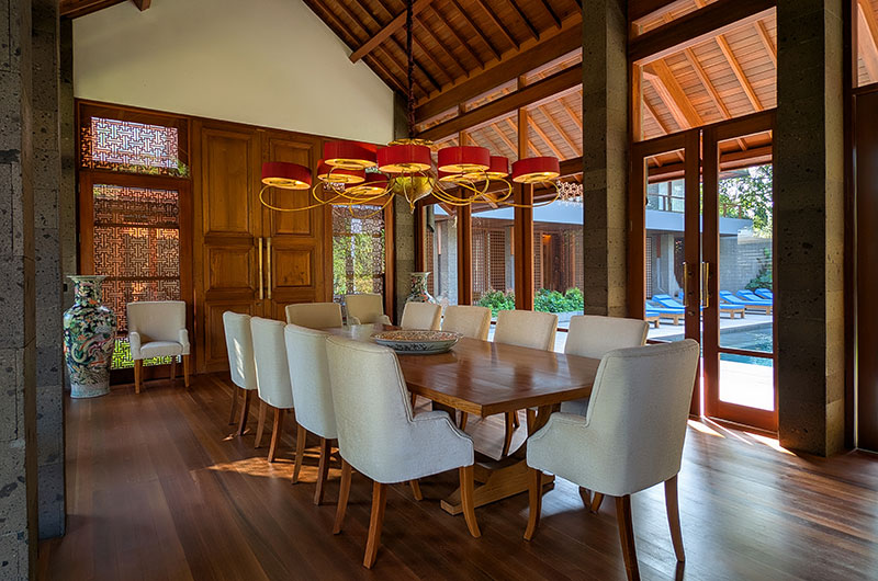 The dining room is a spectacular space made for entertaining, lined with windows on two sides and crowned with a sky-high ceiling. A long, 10-seater table sits at the centre of the room, lit up by a beautiful red-light fixture and framed by indigenous Indonesian artwork. The kitchen is only available for staff to use.