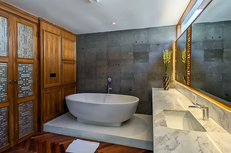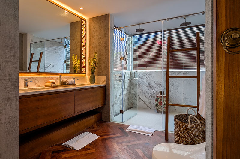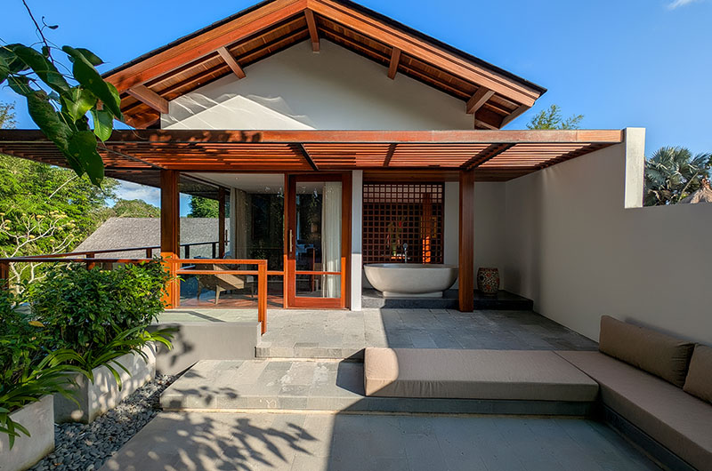 This room is also positioned on the upper floor. It benefits from a king-sized bed and features a private seating area. The ensuite bathroom features double showers, dual vanities, and a toilet. There’s also a beautiful bathtub positioned outside on the terrace.