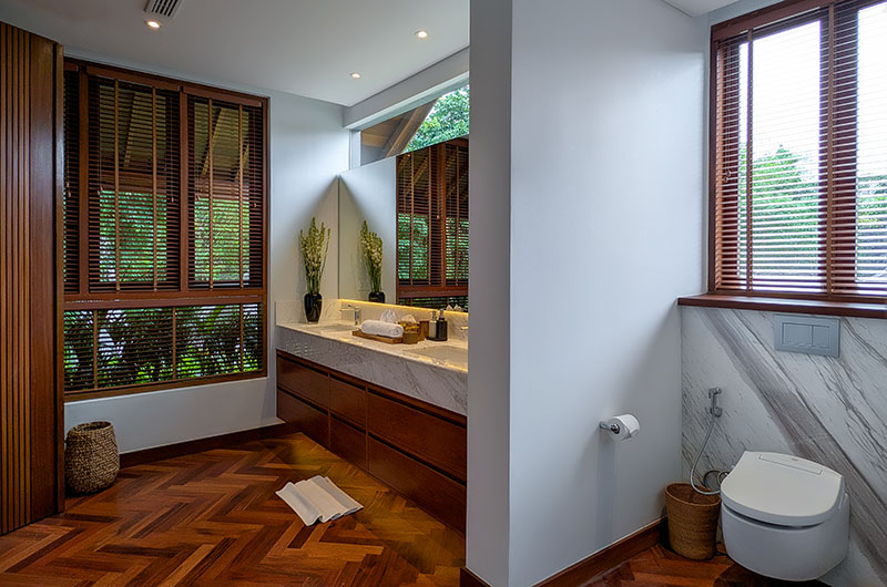 The first bedroom is located upstairs. Framed by large windows and a scenic balcony, the room features a king-sized canopy bed, lounge area, and a walk-in wardrobe. The ensuite bathroom is fitted with double showers, vanity, toilet, and the piece de resistance – indoor and outdoor bathtubs.