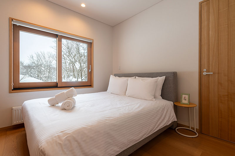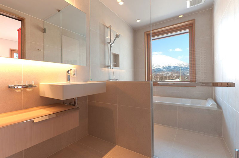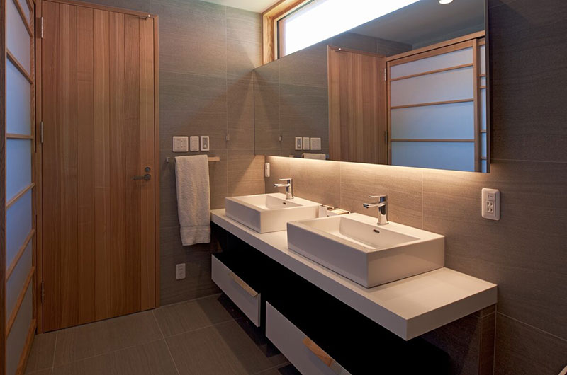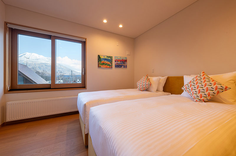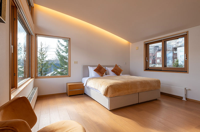 Kazane is a six-bedroom chalet that’s built over three floors. The ground floor houses the garage, ski room, laundry room, powder room, and ensuite tatami room. The middle floor houses four bedrooms – two rooms are ensuite and two rooms share a jack and jill bathroom. A standalone Japanese bath is also located on this floor. The top floor houses the living and dining areas, media room, and one ensuite bedroom.